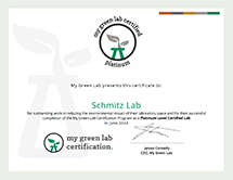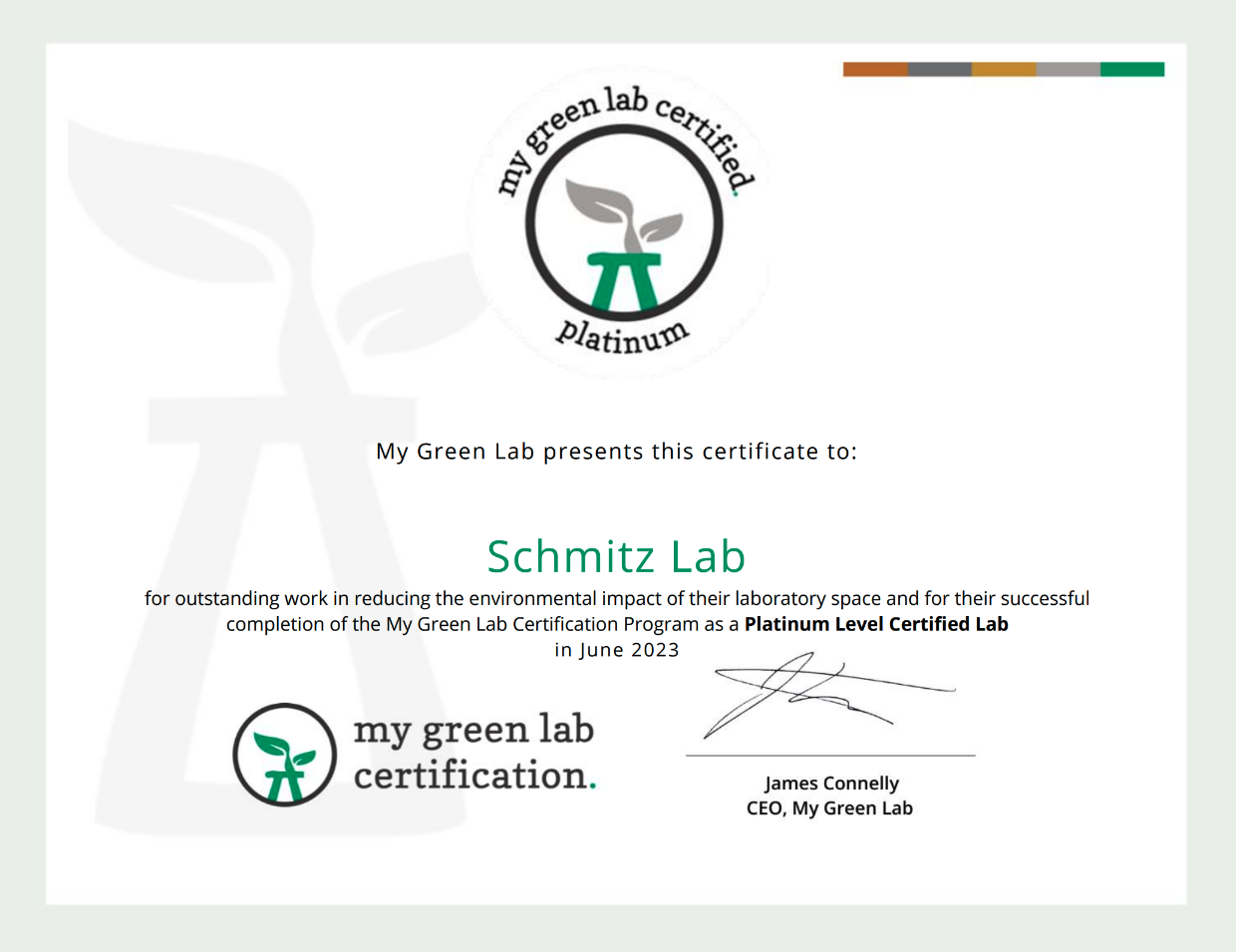 2023: Schmitz Lab has been certified for outstanding work in reducing the environmental impact of it's laboratory space and for the successful completion of the My Green Lab Certification Program as a Platinum Level Certified Lab